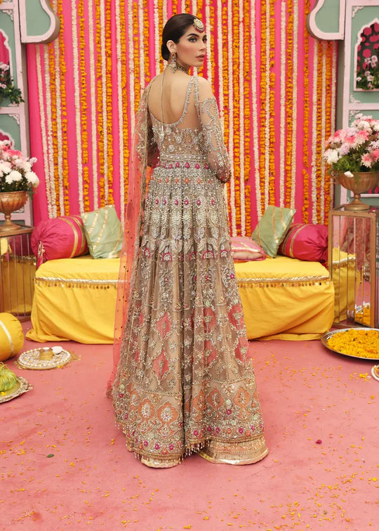The pishwas, made from delicate net fabric, is beautifully embellished with intricate embroidery and beadwork, creating a stunning visual appeal. The lehenga, also crafted from net, features a lavish tissue border that adds a touch of opulence to the overall design. The gold color palette of the ensemble is complemented by the lovely coral net dupatta, which is adorned with detailed embellishments that enhance its beauty.