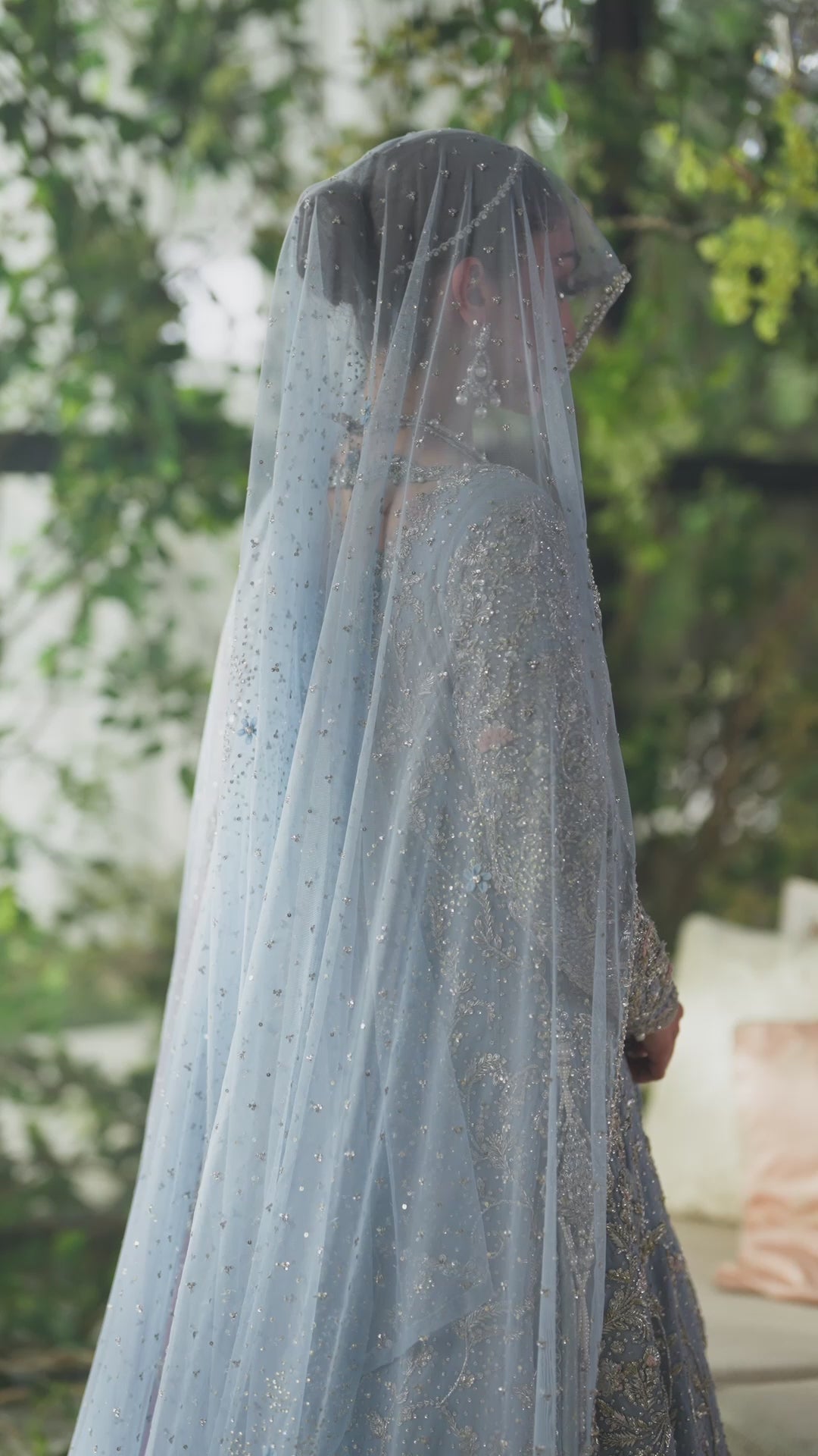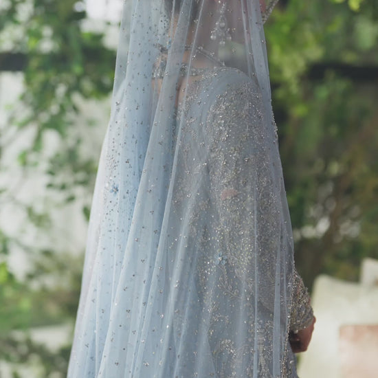 A vision in soft opulence, this ice blue bridal ensemble captures the essence of ethereal beauty and timeless elegance. The long panelled shirt, crafted from pure net, features intricate hand Embellished concentrated at the neckline and daaman, with a heavy jaal cascading throughout the silhouette. Meticulously detailed with kora, dabka, nakshi, and Swarovski stones in a blend of silver and gold, the design shimmers with quiet luxury — making it an unforgettable choice for a wedding celebration.