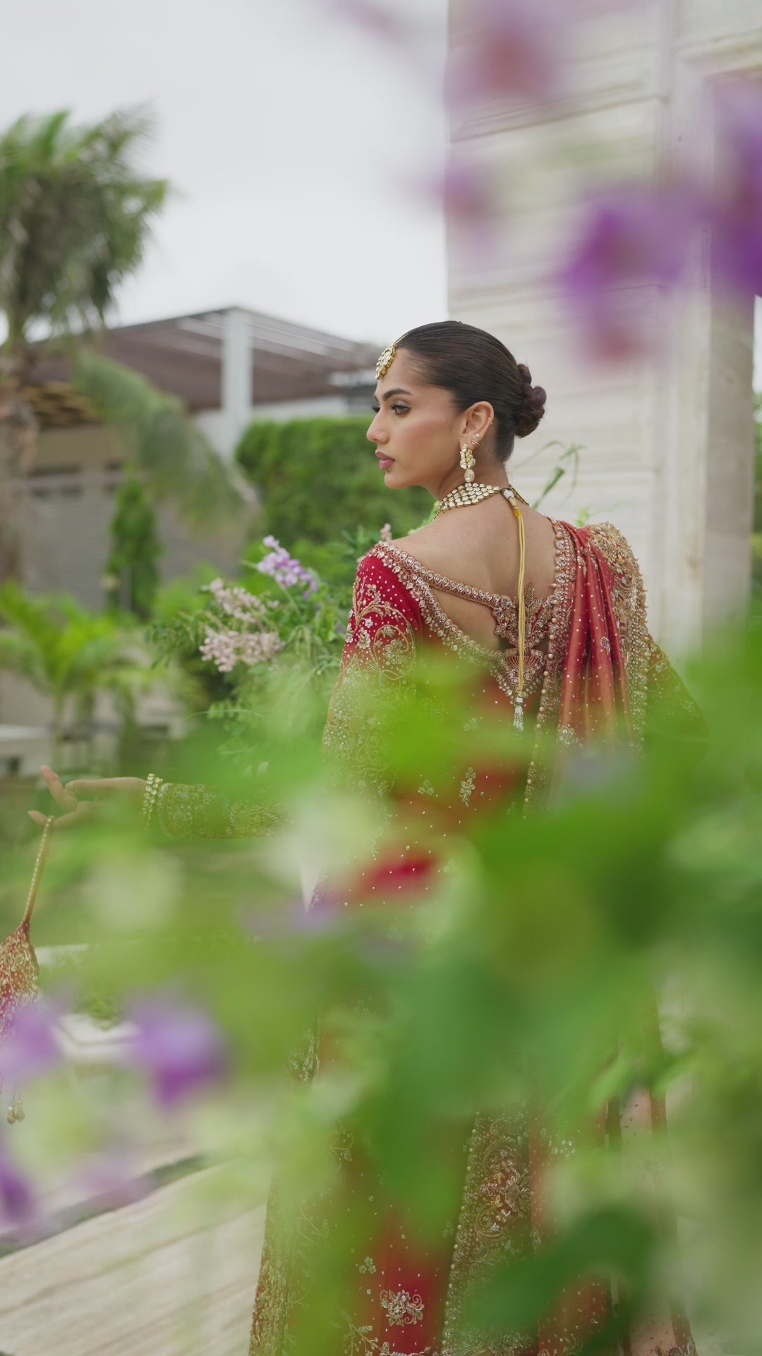 A regal vision in crimson, this bridal ensemble is crafted to embody timeless opulence. The pure cotton net shirt shimmers with an all-over handworked jaal, where kora, dabka, nakshi, sequins, resham, tilla, crystals, and mukaish come together in a lavish tapestry of craft, creating a look of enduring grandeur. The richness deepens with a pure jamawar farshi gharara, its goth heavily embroidered and enhanced with appliqué work, adding depth, drama, and royal presence to the silhouette. Completing the look, a majestic zari tissue dupatta frames the ensemble with elegance, its four-sided embellished border, ornate pallus, and delicate scalloped edges capturing both tradition and refinement. A creation of lasting beauty, this crimson bridal is a true statement of elegance — majestic, radiant, and forever classic.