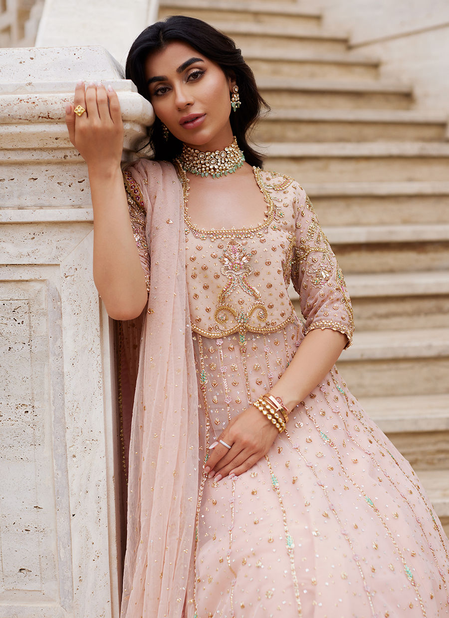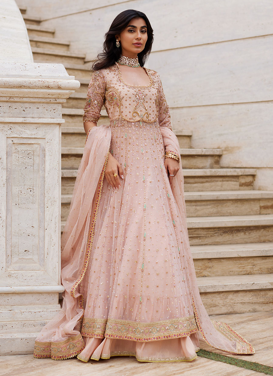 Infused with the softness of peach, this kalidaar embodies artisanal heritage with refined elegance. Crafted in pure net, its voluminous silhouette is delicately adorned with floral bootis and scattered chan, while intricate handwork in kora, dabka, and resham graces its panels with timeless artistry. A handworked border completes the kalidaar, lending depth and sophistication to its graceful flow. Paired with a richly textured zari silk lehnga, the ensemble balances opulence with ethereal charm. The look is crowned with a pure net dupatta, lightly sprinkled with chan and finished with detailed handworked borders, framing the ensemble in cohesive refinement. A true celebration of craft and tradition, this peach kalidaar is designed for moments of festivity and grandeur — romantic, timeless, and exquisitely classic.