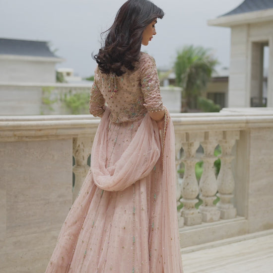 Infused with the softness of peach, this kalidaar embodies artisanal heritage with refined elegance. Crafted in pure net, its voluminous silhouette is delicately adorned with floral bootis and scattered chan, while intricate handwork in kora, dabka, and resham graces its panels with timeless artistry.