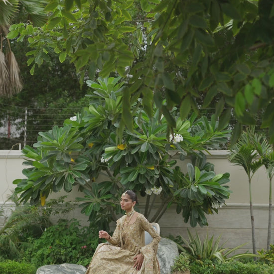 Cast in radiant gold, this bridal ensemble captures timeless majesty softened with whispers of pastel romance. The pure zari tissue kalidaar shimmers with zardozi craftsmanship, its surface alive with kora, dabka, sequins, crystals, tilla, and resham embroidery in pale pink and green hues, weaving a story of delicate elegance upon a luminous base.