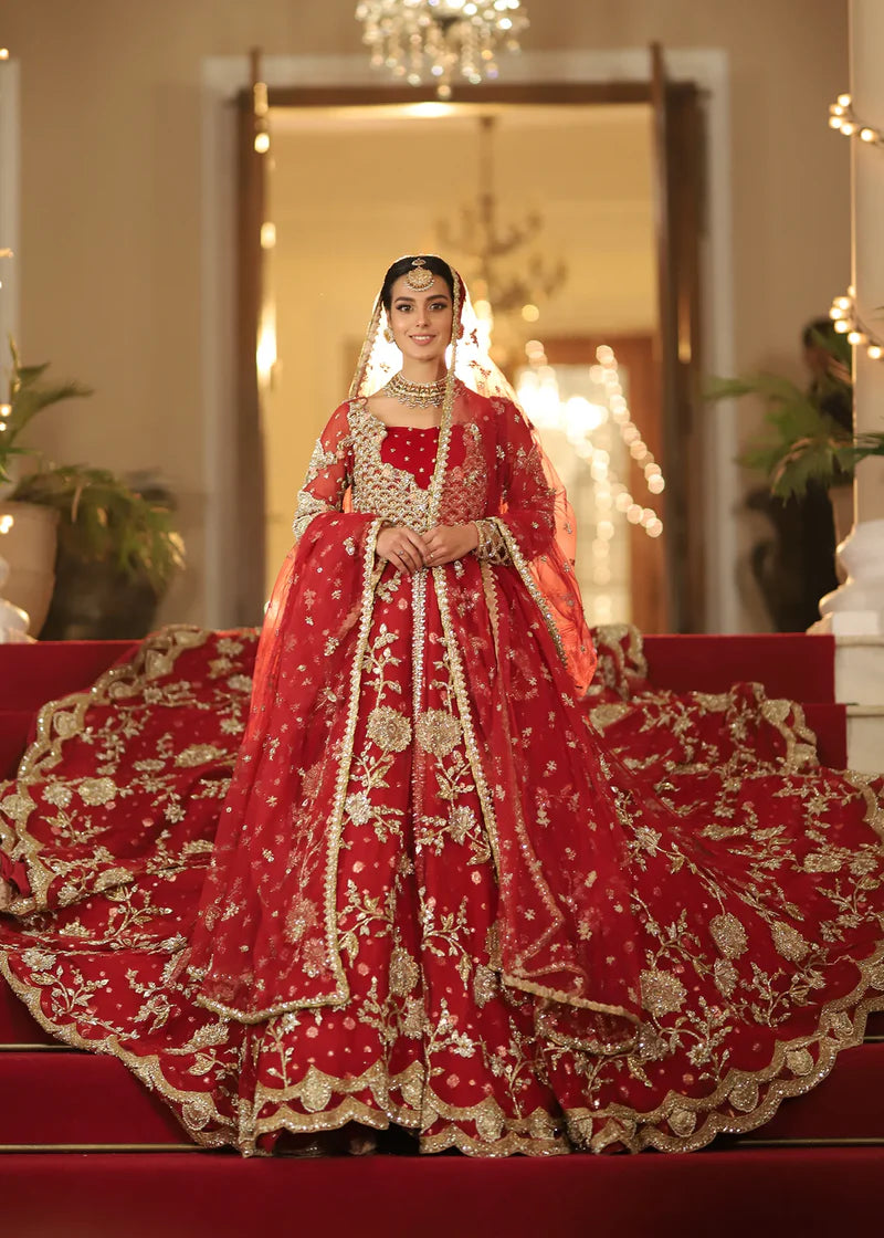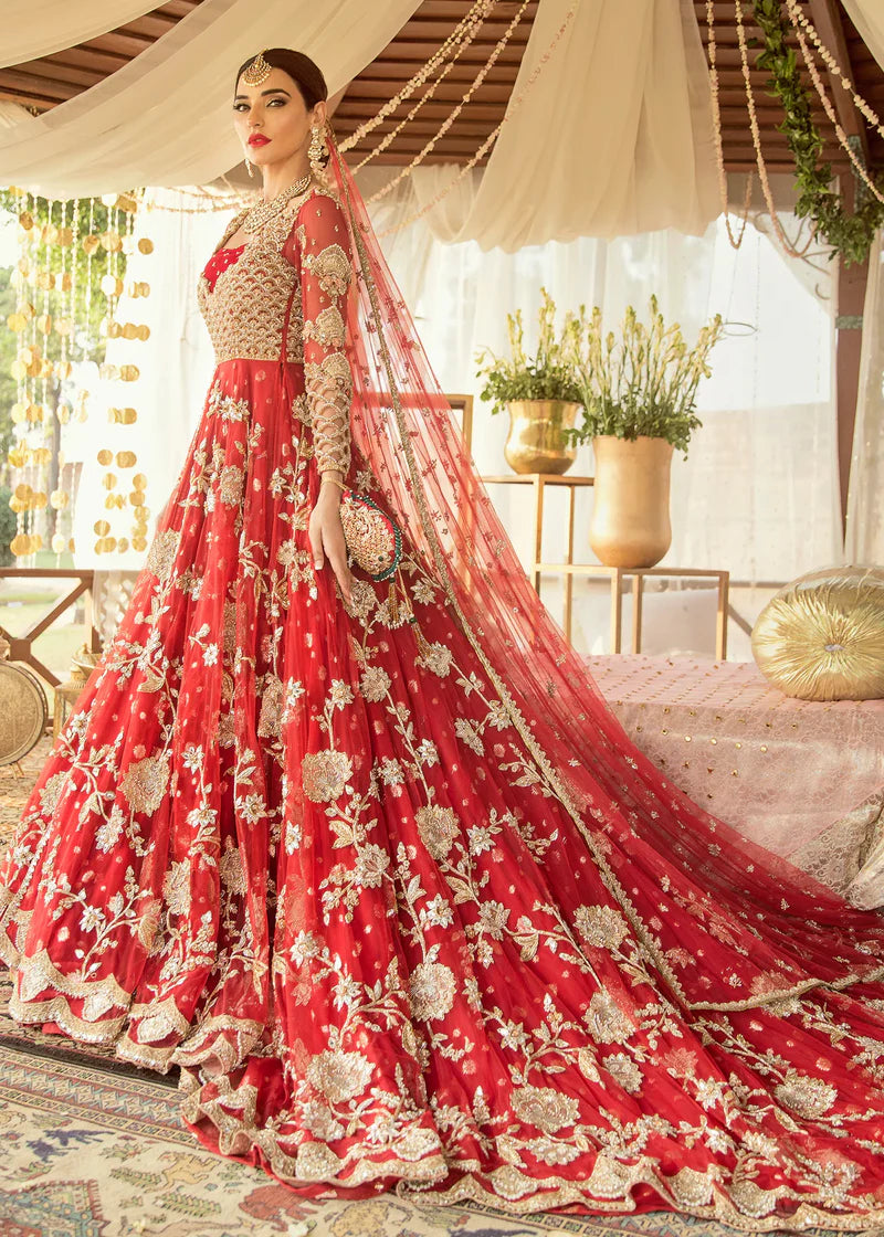 A resplendent red hand crafted net peshwas featuring a glamorous train. The floral jaal is composed of peach flowers with handwork set in various shades of gold zardozi. Sleeves and bodice worked intensely with crystal and pearl mesh.