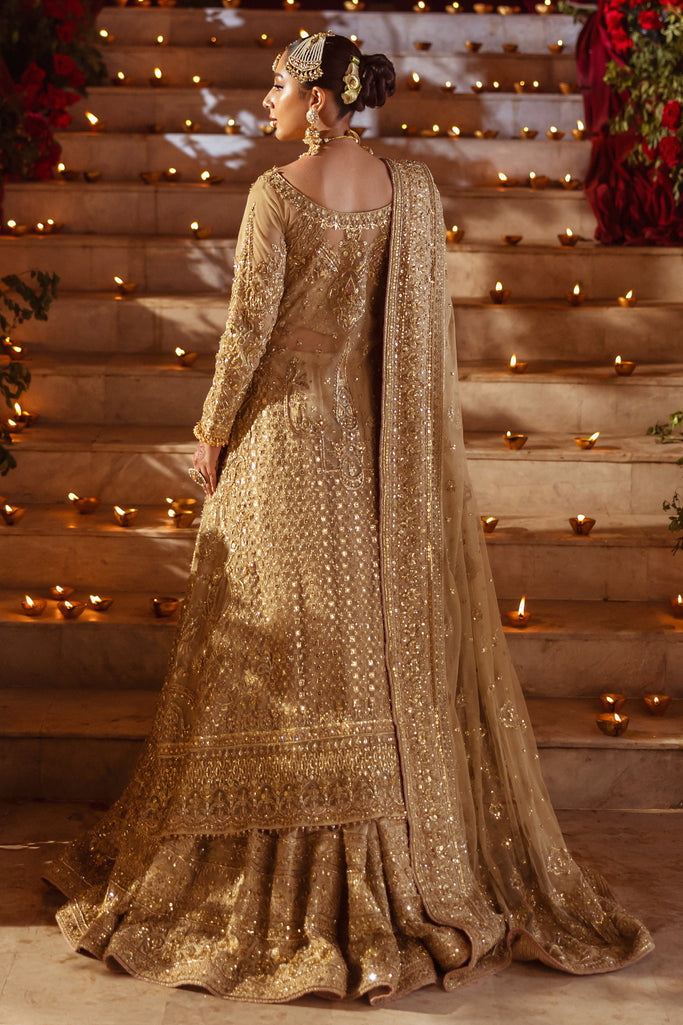 Paying ode to the old-world charm, Roshan Ara is the pinnacle of beauty! The 5-piece skin gold bridal outfit comprises of hand adda embellished & textured inner & plain voluminous tissue lehenga adorned with heavy layers of hand adda embellished & embroidered borders finished with lace & stiff facing. Now the showstopper is the heavily hand adda embellished composed gown featuring naqshi, dabka, payal, sitari work, cut dana, stone work & crystal hangings details & embroidery along with texture play, pattern work & delicate resham work along with heavy thread texture details & goti work & composed motifs on the front and back. The gown openings & hem are bedazzled with crystal work and the full fitted sleeves are adorned with handmade crystals with gown finishing comprising of crystals & stones as well. The heavily bejeweled dupatta is adorned with heavy hand adda embellishments & embroidered motif spread finished with chunky embellished borders & pastel contrast facing with finest finishing to give the bride that majestic look. Outfit comes with a statement structured clutch with embellishments & embroidery details.