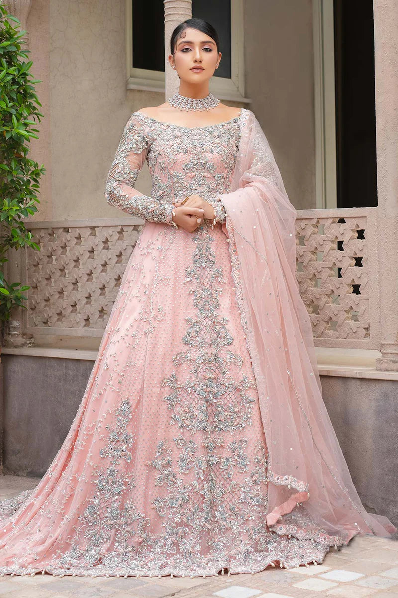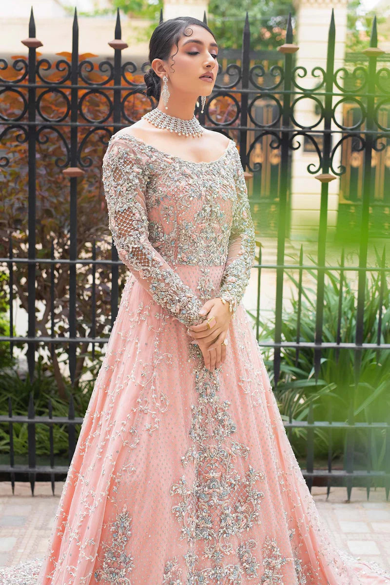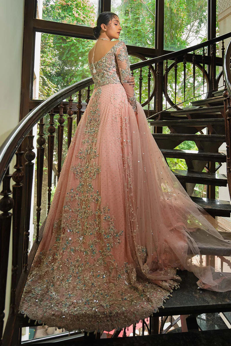 An exquisitely embellished gown laden with glass beads, moonlight crystals, pearls handmade flower petals and exotic stones. It has a dupatta which trails at the back laden with delicate hand embellishment.