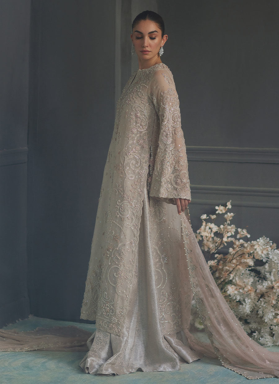 It is layered over a structured zari silk bustier for a seamless blend of coverage and style. The look is paired with a pure silver banarsi lehenga, woven in rich zari for a luminous, heritage-inspired base. Completing the set is a net dupatta, finished with a matching resham embroidered border and embellished with pearls, crystals, and an all-over crystal chan, adding just the right touch of shimmer.